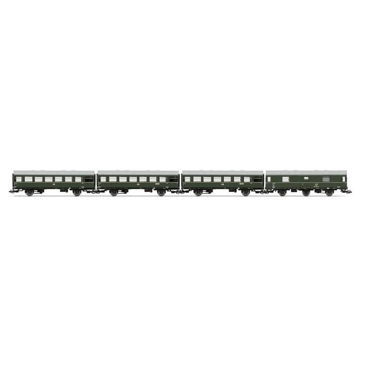 HN9510 DR, 4-tlg. Wagenset “Rekowagen”, bestehend aus einem Postwagen und 3 zweiachsigen Rekowagen in dunkelgrüner Lackierung mit einem Zierstreifen, Ep. III