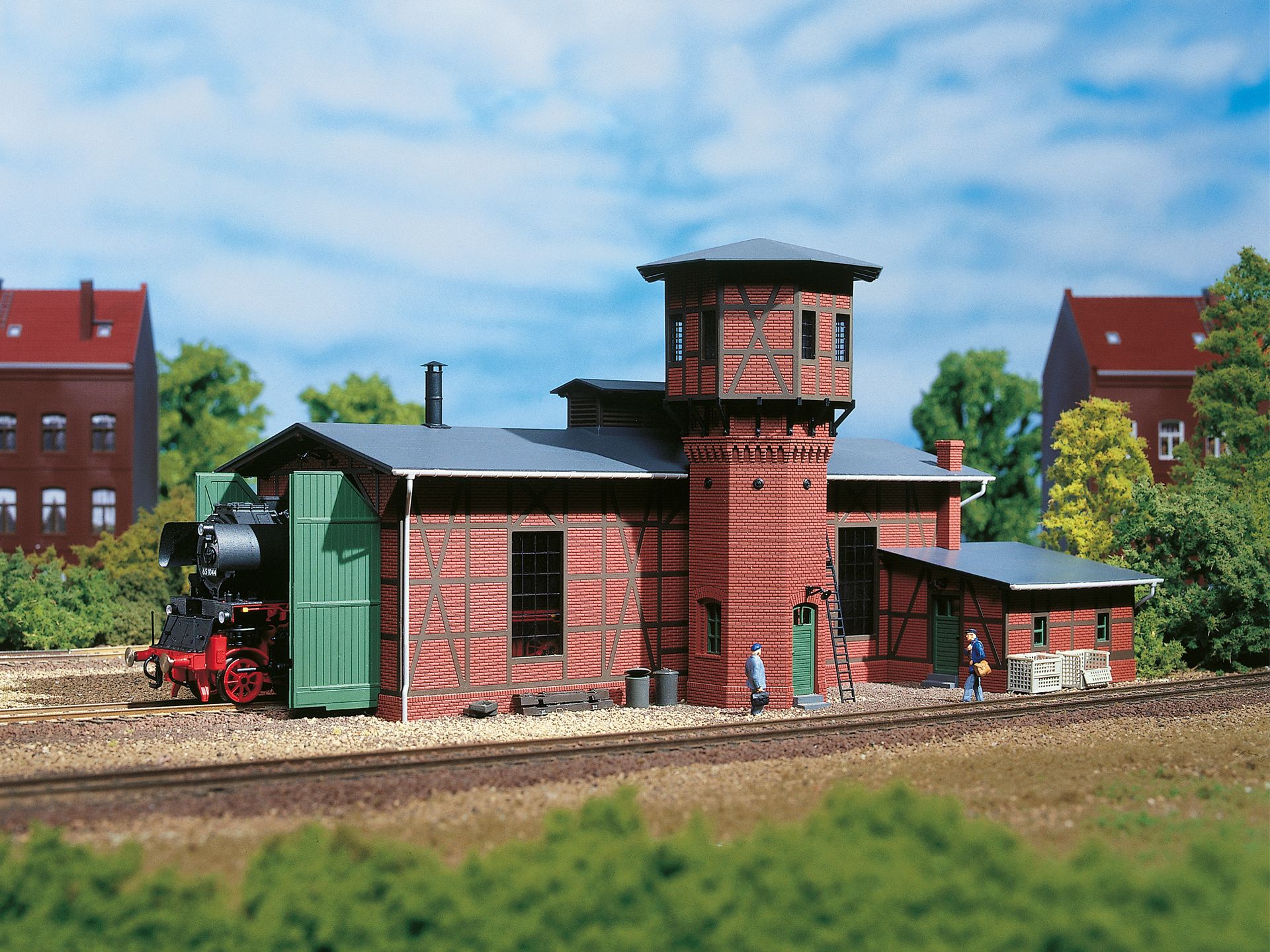 Auch Schmalspurlokomotiven sind für diese Strecke absolut authentisch, da 1948 die Wiedereröffnung als 750 mm Schmalspurstrecke erfolgte. Die Tore sind manuell beweglich, Lampen liegen dem Bausatz bei. Die Auhagen Untersuchungsgruben (Art. 41 612) eignen sich zum Einbau. Lokschuppen und Wasserturm sind auch einzeln aufstellbar. Den Wasserbehälter erreicht man über eine filigrane Leiter. Lichte Torhöhe ohne Gleis 63 mm, Lichte Torbreite 48 mm, der Lokschuppen ist geeignet für Loks bis LüP 208 mm. Abmessung: 245 x 120 x 127 mm