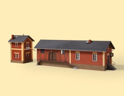 Dieses Ensemble gehört zur Museumsbahn Steinbach-Jöhstadt im Preßnitztal. Der Wasserkran ist beweglich. Nasenuhr, Lampen, Briefkasten und Ausguss liegen bei. Das Geländer ist aus stabilem Karton in Lasercut-Technologie gefertigt.