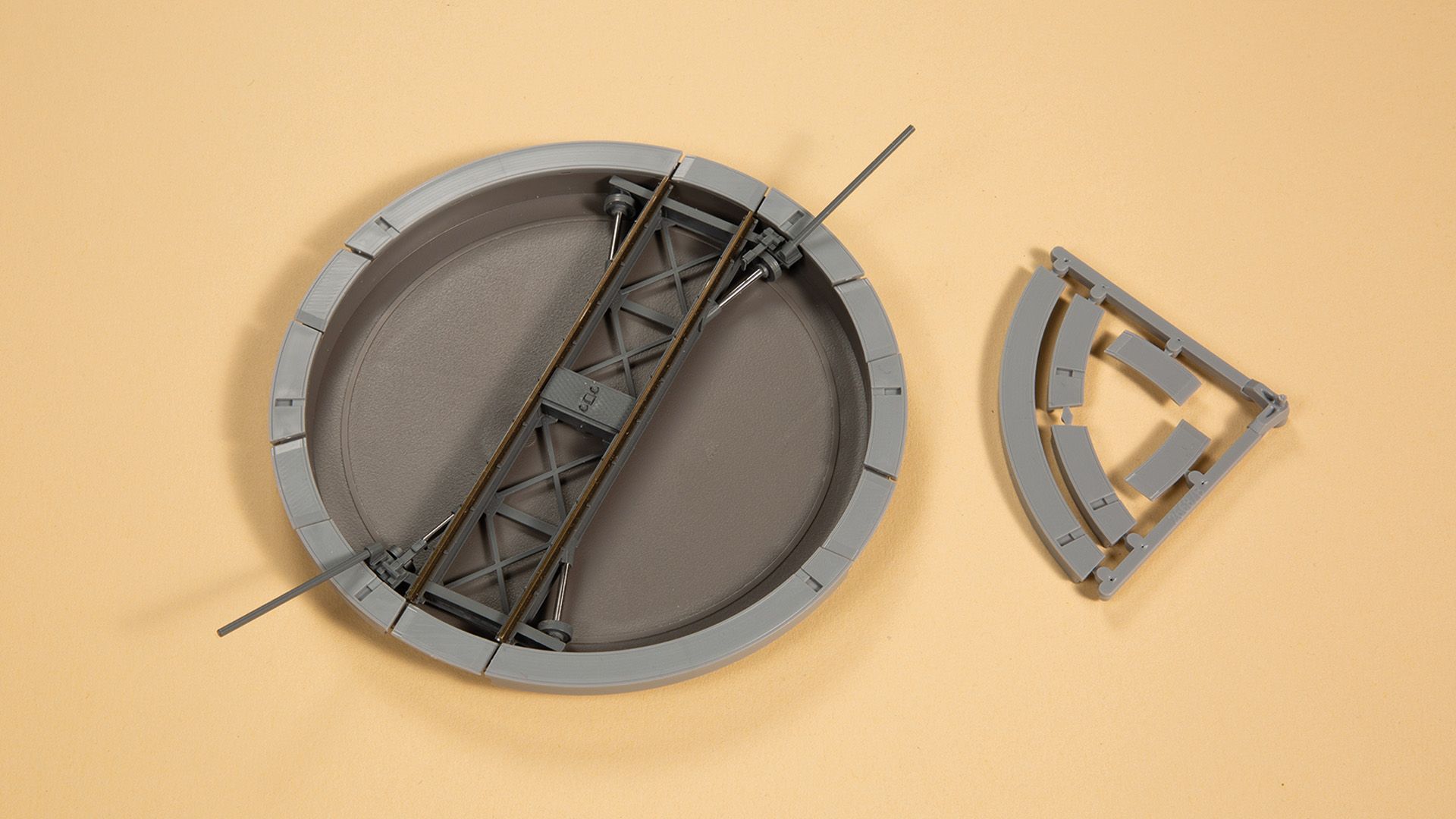 Diese manuelle Drehscheibe ist eine robuste Lösung für alle, die bewusst ohne Elektrik arbeiten möchten. Der Bausatz ist u.a. für Waggons gedacht und kommt ohne Stromübertragung und ohne elektrische Funktionen aus. Ideal für industrielle und gewerbliche Szenen mit einfachem Rangierbetrieb. Die Länge der Bühne ist ca. 95 mm, der Gesamtdurchmesser 111 mm, Abgangswinkel 90/45 Grad. Passend für Gleissysteme mit 2,07 mm Profilhöhe (z. B. Tillig).