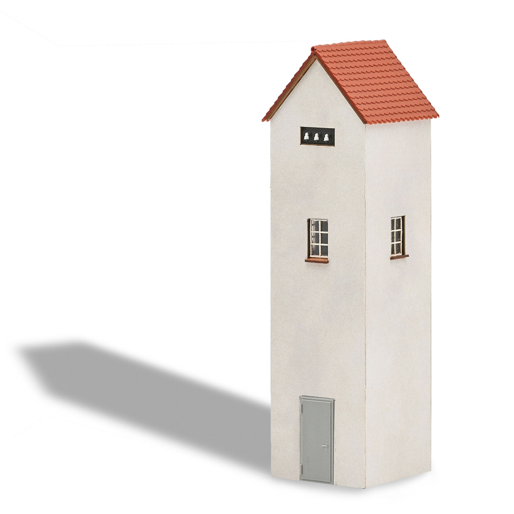 Bausatz für eine typische Trafostation, wie sie bis in die 1980er Jahre zur Stromversorgung umliegender Gebäude diente. Hellbeige verputzter Turm mit Satteldach in Ziegeloptik, Sprossenfenstern auf allen vier Seiten und jeweils 3 Isolatoren an den Giebelseiten.