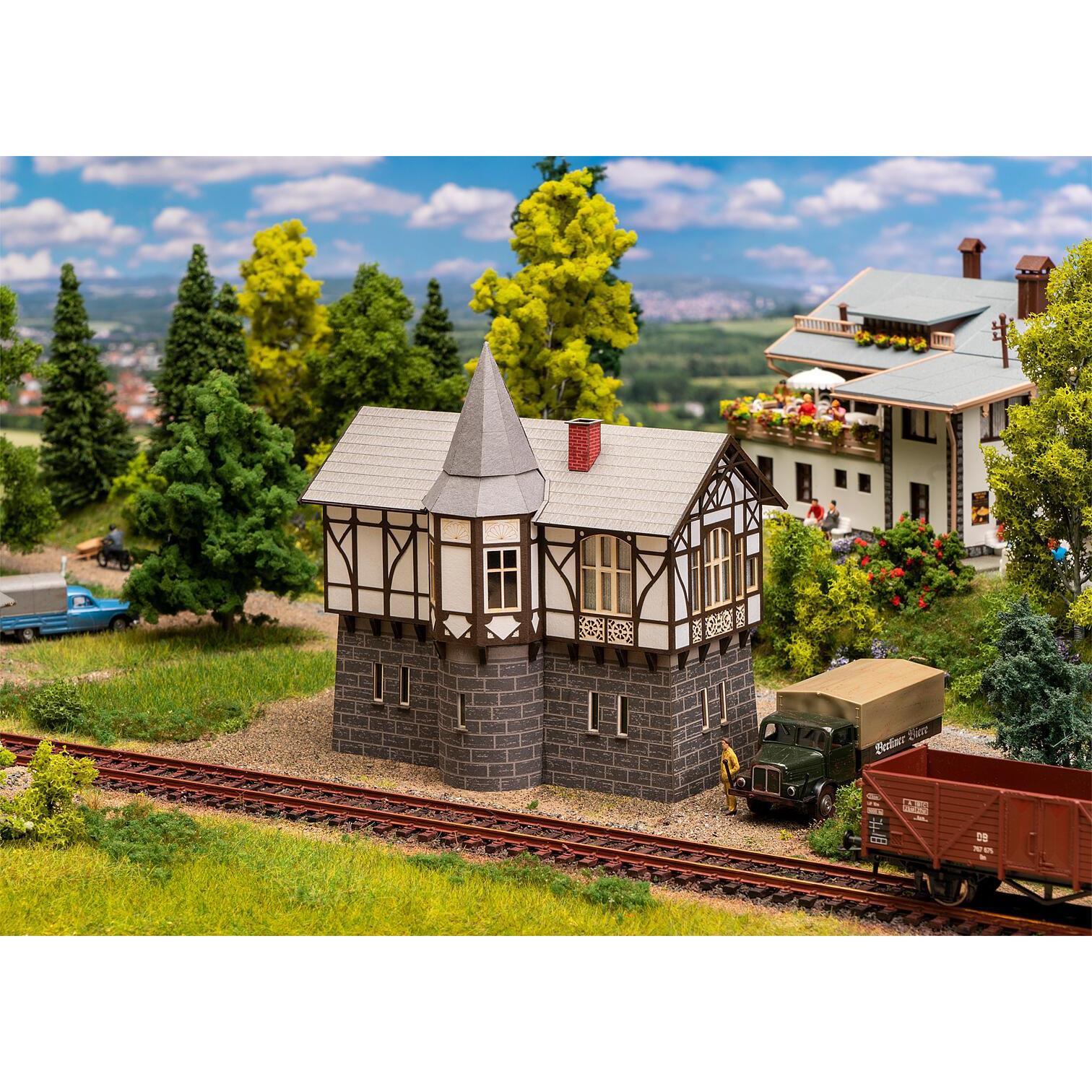 Harzer Heimatstil. Lasercut-Modell nach dem Originalvorbild des 1897 erbauten, heute denkmalgeschützten Stellwerks Thale Ost mit gemauertem Erdgeschoss und einem Fachwerkobergeschoss mit Erkertürmchen.