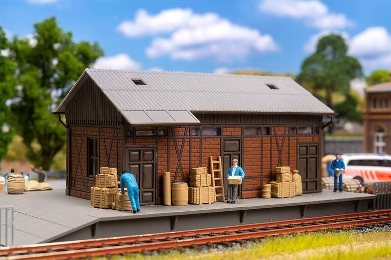Dieses Aktions-Set verwandelt jeden Bahnhof in einen authentischen Güterumschlagplatz! Das sandfarbene, gemauerte Verwaltungsgebäude sorgt für Ordnung im Betriebsablauf, während ein roter gedeckter Ziegel-Güterschuppen als Zwischenlager für die Ware dient. Eine schlichte Holzhalle, ein Trafohäuschen und eine Dieseltankstelle runden die Szene ab – perfekt für stimmungsvolle Logistik in Miniatur.