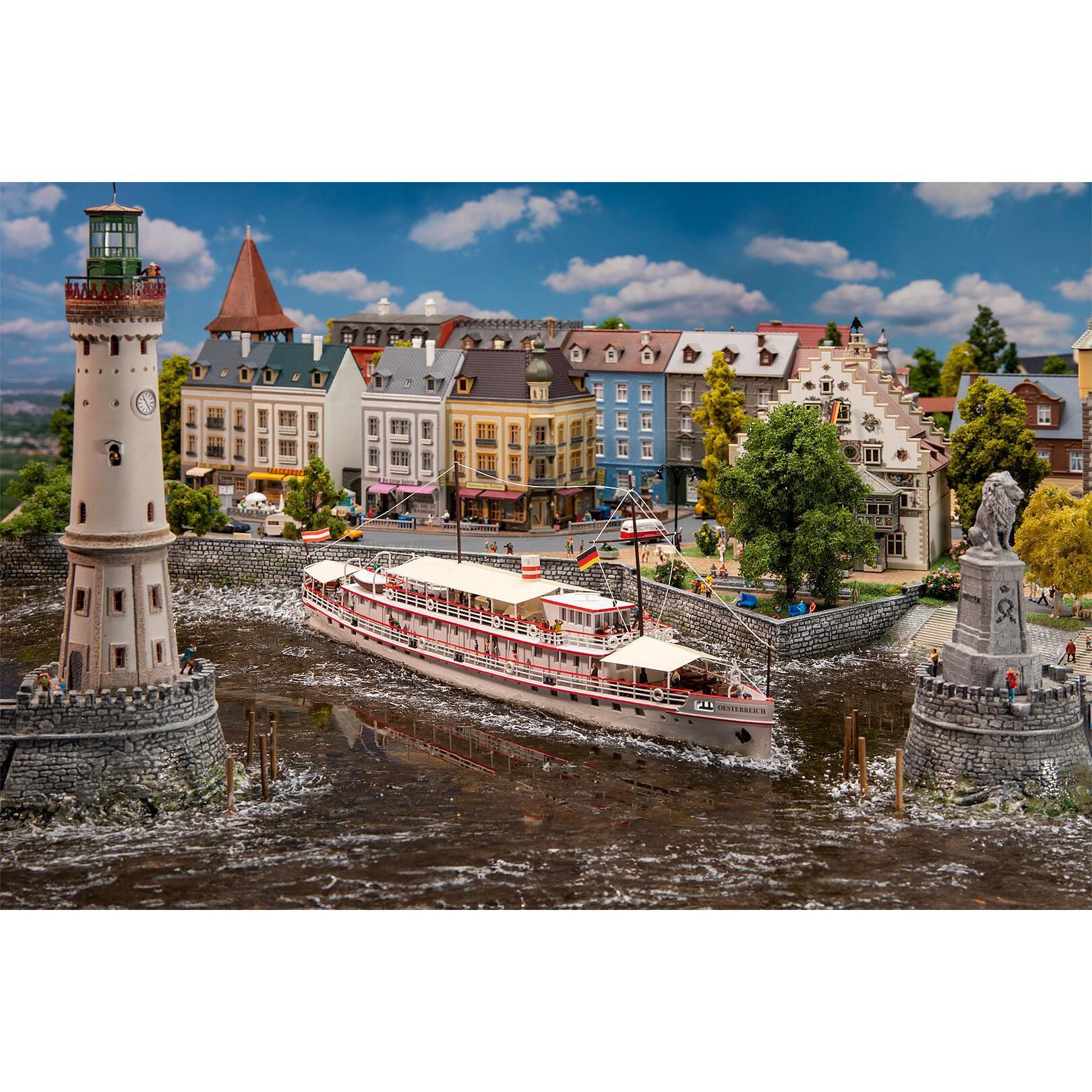 Maßstäbliches Modell des Art déco Bodensee-Fahrgastschiffes, das seit 1928 bis heute auf dem Bodensee verkehrt. Das Modell zeigt die heutige Bauform nach der Restaurierung 2019. Die historische Schifffahrt Bodensee GmbH wirbt auf Ihrer Seite: »Bezaubernd anmutig ist nicht nur das Äußere der Oesterreich. Wer die Gangway betritt, ihr langsam näherkommt, der spürt sofort die unglaubliche Leichtigkeit, die diesem Schiff innewohnt. Die Atmosphäre an Bord – prickelnd, anregend wie ein Glas Champagner. Spätestens nach dem ersten Rundgang, wenn man mit einem köstlichen Aperitif in der Hand an Deck der Oesterreich auf den See hinausgeleitet, ist jeder Gedanke an den Alltag verflogen. Nach der umfassenden Renovierung strahlt jedes Detail. Ein wunderbarer Hingucker auf einer Modellanlage oder auch als Standmodell in der Vitrine (z.B. Faller 759805).