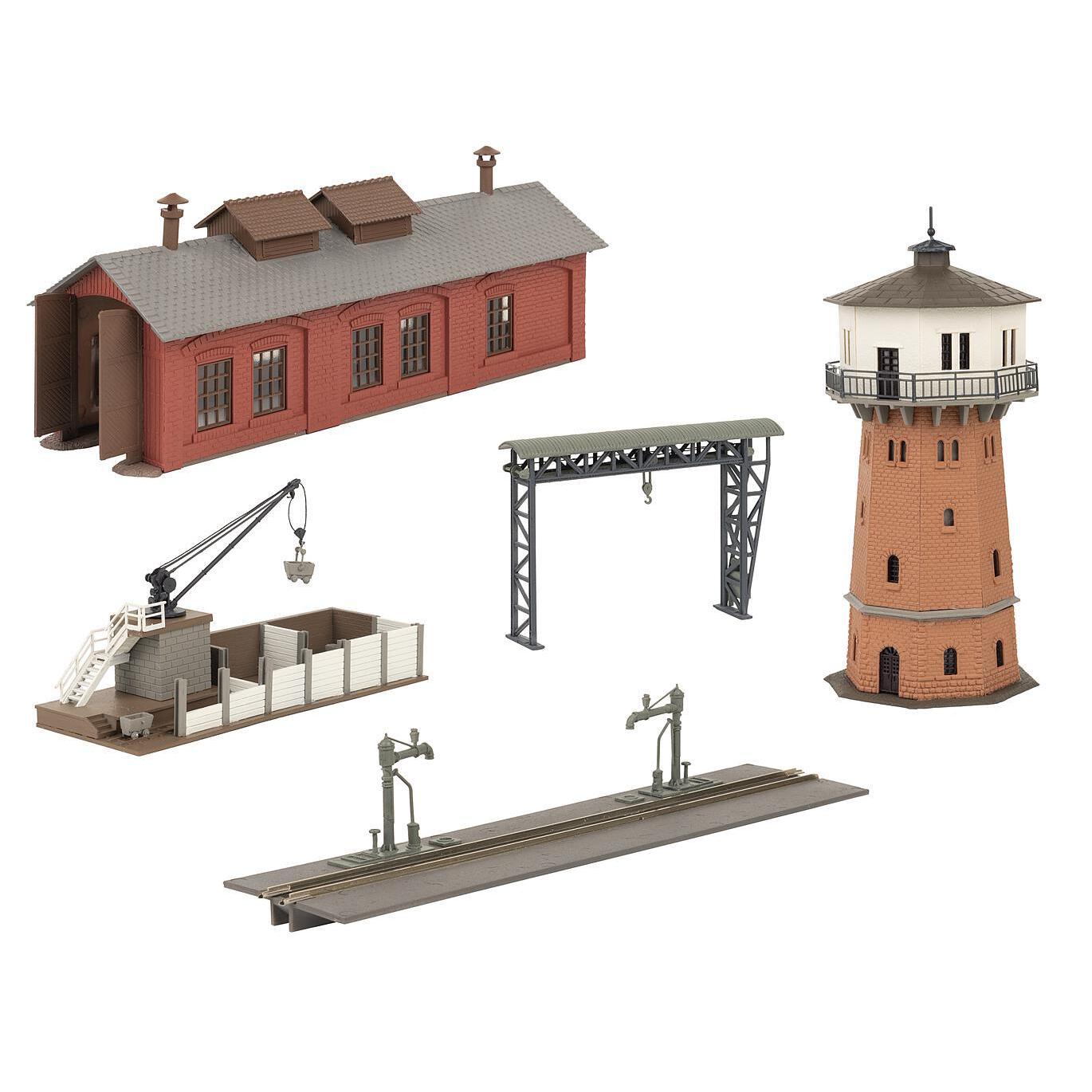 Eine Lokomotive will gut gepflegt sein, doch mit diesem Bahnbetriebswerk aus alter Zeit ist das kein Problem! Das Set umfasst einen Lokschuppen aus rotem Ziegelstein, eine Ausschlackanlage, einen Wasserturm, einen Bockkran und eine Bekohlungsanlage. Diese Details sind hervorragend geeignet, um der Modellbahnanlage etwas historischen Flair zu verleihen. Inhalt: Lokschuppen, Ausschlackanlage, Wasserturm, Bekohlungsanlage, Bockkran