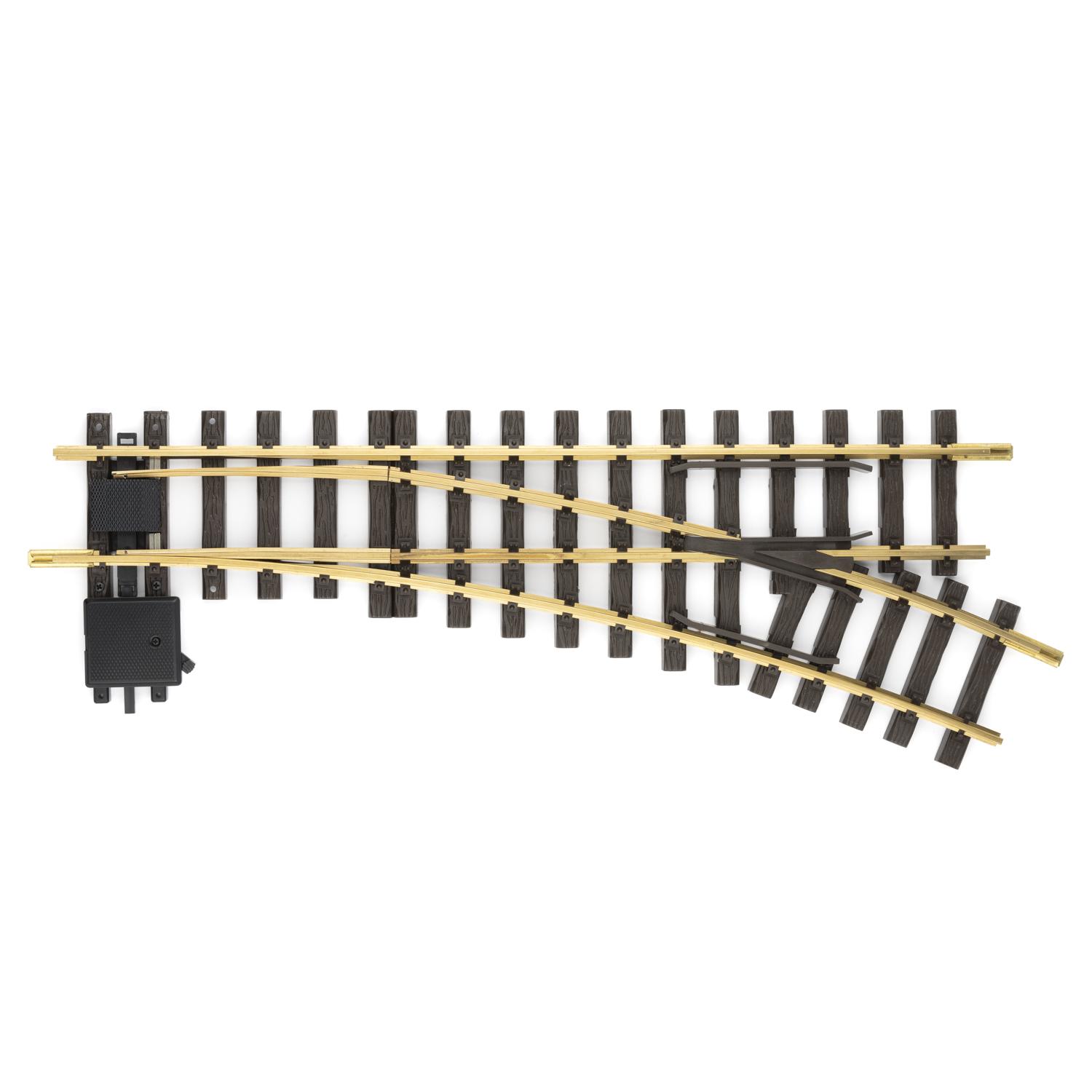 Gerades Gleis 440 mm. Abzweigendes Gleis rechts R3, 22,5°. Der beiliegende Handweichenantrieb lässt sich rechts oder links an der Weiche montieren. Die Weiche ist Nachrüstbar mit dem elektrischen Weichenantrieb 12010.