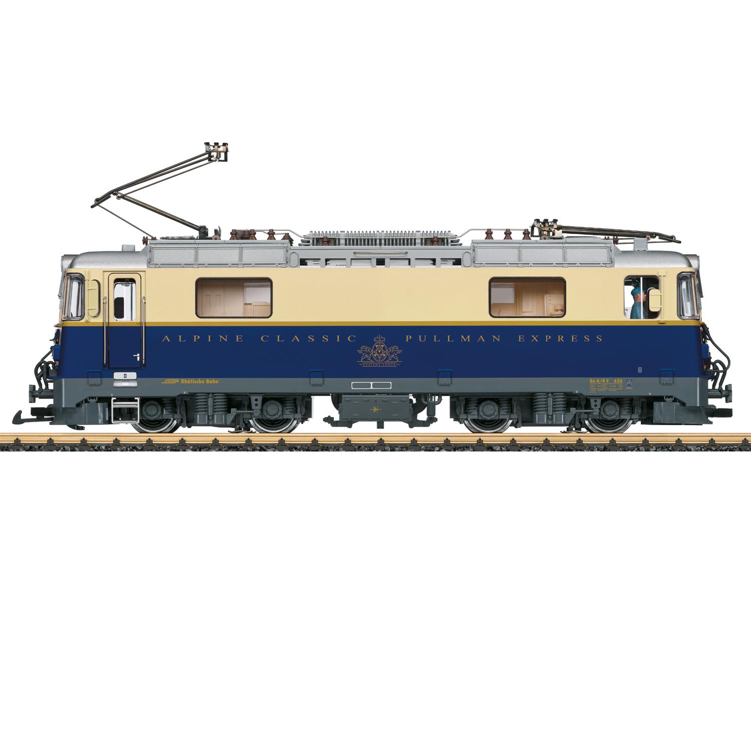 Vorbild: Auf dem Netz der Rhätischen Bahn sind die Loks der Baureihe Ge 4/4 II, die mit ihren 2.300 PS und ihrer Höchstgeschwindigkeit von 90 km/h vor allen Zugarten zu sehen. Bereits 1973 wurde die erste Lok dieser Baureihe – damals noch im dunkelgrünen Anstrich und mit runden Scheinwerfern – an die RhB abgeliefert. Mehrfach modernisiert und umgebaut – unter anderem erhielten die Loks eckige Scheinwerfer – diese sind fast alle noch im Einsatz, vom Nahverkehrszug bis zum Glacier-Express kann man die Loks erleben. Diese Lokomotive, die sogenannte Pullman Lok fährt in einer Sonderlackierung. In dieser Lackierung wird die Nr. 626 in Zukunft auf der Rhätischen Bahn zu sehen und zu bewundern sein.