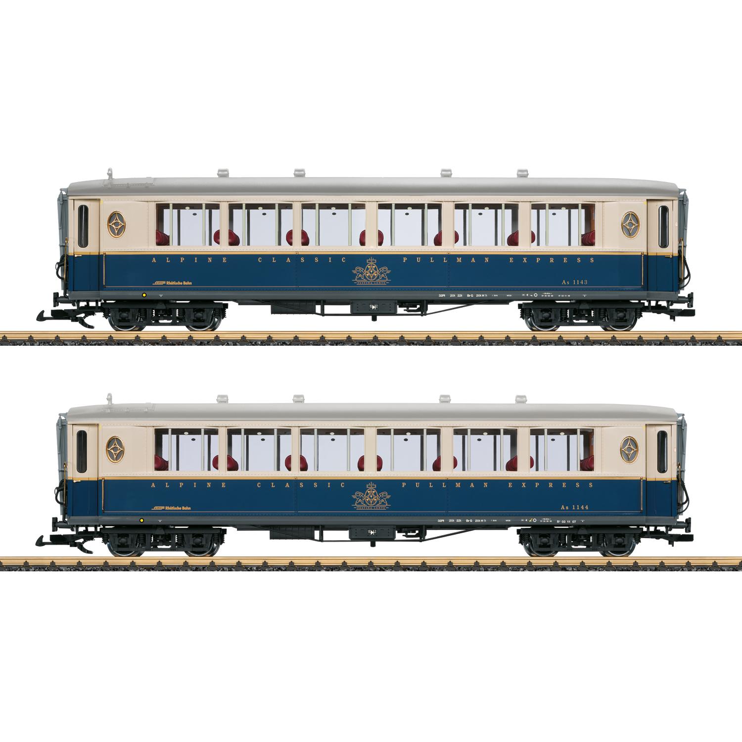 Die RhB (Rhätische Bahn) besitzt vier solcher historischer Salonwagen. Diese elegant und luxuriös eingerichteten Wagen sind als „Alpine Classic Pullman Express im Einsatz“. Das LGB Set bildet die beiden Salonwagen As 1143 und As 1144 korrekt nach. Die Wagen sind vorbildgerecht beschriftet und lackiert, verfügen über eine komplette Inneneinrichtung, Innenbeleuchtung und die Türen lassen sich öffnen. Wagenlänge über Puffer jeweils 66 cm.