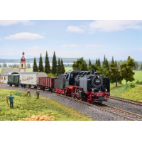 Modell: Schlepptender-Lokomotive mit Digital-Decoder mfx und umfangreichen Geräuschfunktionen. Spezialmotor im Kessel. 3 Achsen angetrieben, Haftreifen. Kessel und Fahrwerk aus Metall gefertigt. Rauchsatz 72270 serienmäßig eingebaut. Fahrtrichtungsabhängig wechselndes Dreilicht-Spitzensignal konventionell in Betrieb, digital schaltbar. Beleuchtung mit warmweißen Leuchtdioden (LED). Kurzkupplung mit Kinematik zwischen Lok und Tender. Hinten am Tender kinematikgeführte Kurzkupplung mit NEM-Schacht. Vorne an der Lok Kurzkupplung im NEM-Schacht. Alle Wagen mit kulissengeführten Kurzkupplungen. Länge des Zuges 54,4 cm. Inhalt: 12 gebogene Gleise 24130, 7 gerade Gleise 24172, 5 gerade Gleise 24188, 2 gebogene Gleise 24224 und 1 Paar Weichen 24611 und 24612. Gleisanschlussbox, Schaltnetzteil 230 V/36 VA und Mobile Station. Illustriertes Spielbuch mit vielen Tipps und Anregungen. Erweiterungsmöglichkeiten mit den C-Gleis-Ergänzungspackungen und mit dem gesamten C-Gleis-Programm.