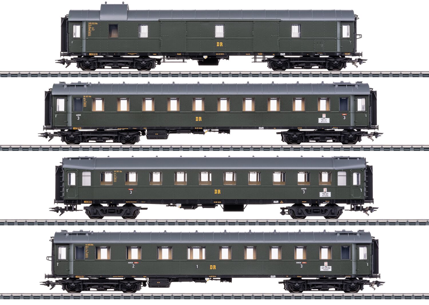 Vorbild: 4 Schnellzugwagen der Einheitsbauart 1928-30 und 1923 “Hecht” der Deutschen Reichsbahn der DDR (DR/DDR). 1 Schnellzug-Gepäckwagen Pw4ü-29. 1 Schnellzugwagen C4ü-28, 3. Klasse, Ordnungsnummer 1. 1 Schnellzugwagen C4ü-23 “Hecht”, 3. Klasse, Ordnungsnummer 2. 1 Schnellzugwagen ABC4ü-29, 1./2./3. Klasse, Ordnungsnummer 4. Zuglauf für den Schnellzug D 11: Dresden-Warnemünde, mit Kurswagen Praha-Kobenhavn (Wagen mit Ordnungsnummer 4). Alle Wagen in flaschengrüner Grundfarbgebung. Betriebszustand Epoche IIIa, Anfang der 1950er Jahre.