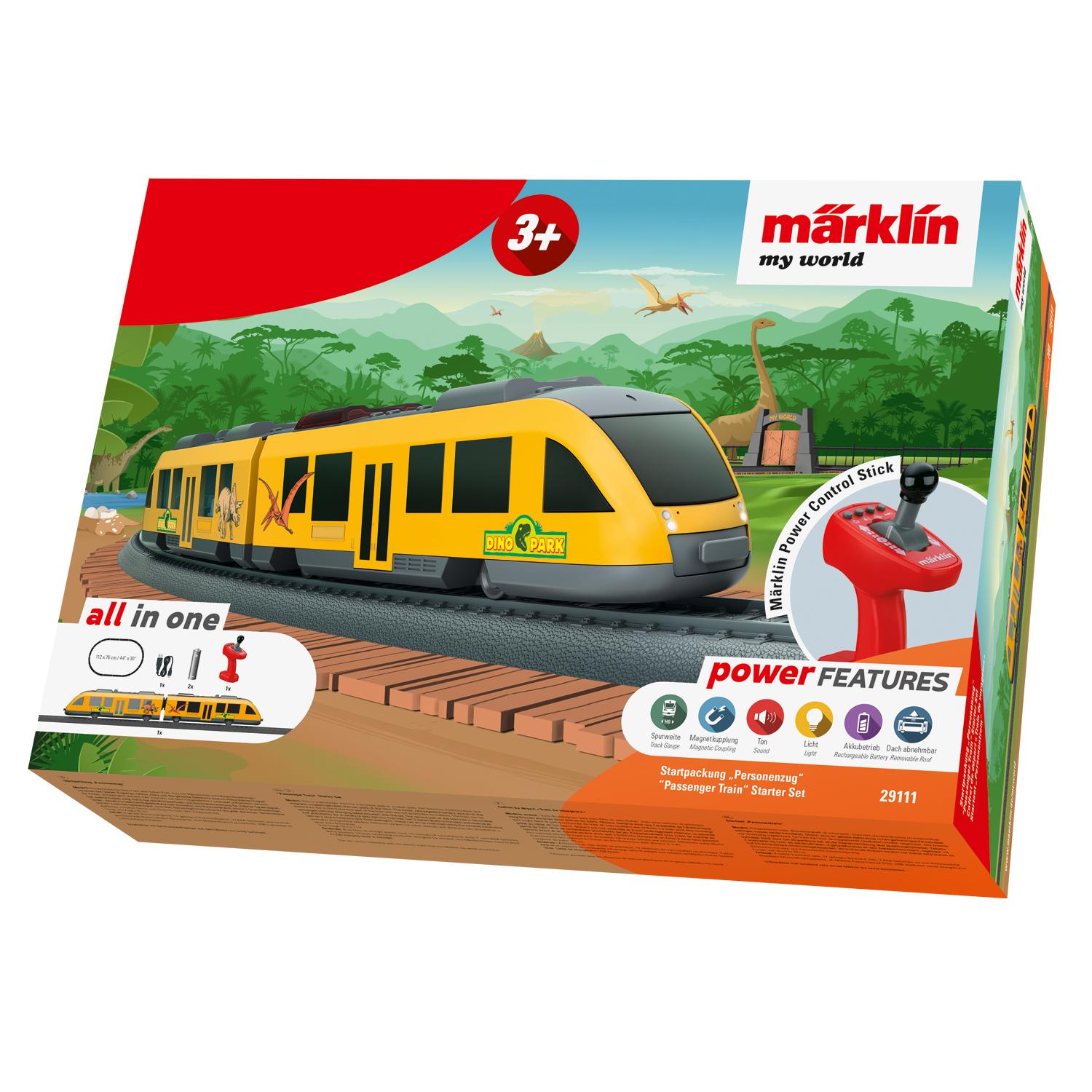 Modell: Personenzug für Dino-Park oder Safari-Park. Zug mit Akkuantrieb und Magnetkupplungen zwischen den beiden Zugteilen. Motor, Akku und die gesamte Elektronik sind im motorisierten Zugteil für Kinder unzugänglich verbaut. Der Zug kann mit dem mitgelieferten Ladekabel aufgeladen werden. Der zweite Zugteil sorgt durch das abnehmbare Dach und die Inneneinrichtung für vielerlei Spielmöglichkeiten. Jeweils 3 Geschwindigkeitsstufen bei Vorwärts- und Rückwärtsfahrt, sowie 3 Soundfunktionen und ein Zweilicht-Spitzensignal, sind über das kindgerechte Infrarot-Fahrgerät steuerbar. Verschiedene Aufkleber zu Safari Tieren und Dinos für eine tolle Zuggestaltung. Länge des Zuges 33 cm. Inhalt: 12 gebogene und 4 gerade Kunststoffgleise und ein kindgerechtes kabelloses Infrarot-Steuergerät, dem Märklin Power Control Stick. USB-Ladekabel im Lieferumfang enthalten. Erweiterbar mit den Kunststoffgleisen aus dem Märklin my world Sortiment.