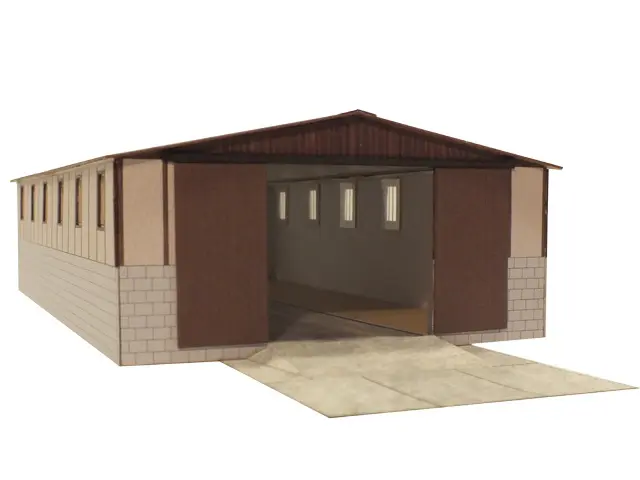 Hier angeboten: Rinderstall in typischer Bauart – das Original steht in Bertsdorf im Zittauer Gebirge. Das Unterteil ist betoniert und oben stehen Fertigteilelemente. Die großen Tore ermöglichen die Durchfahrt für Traktoren.