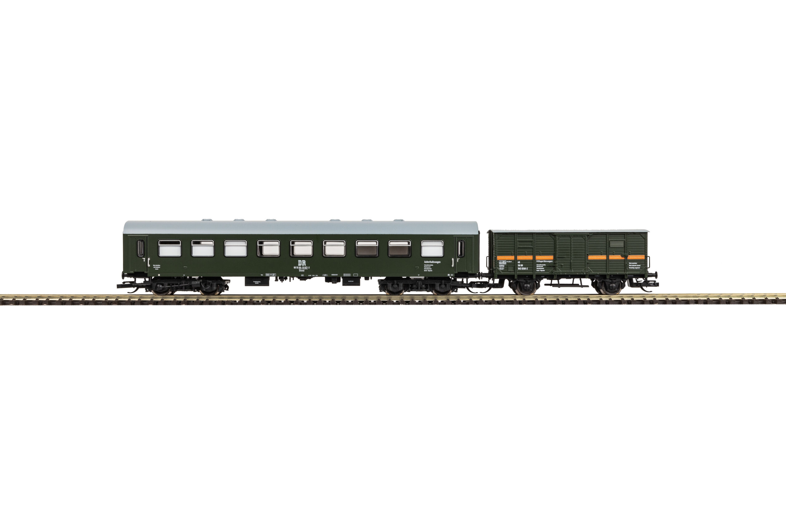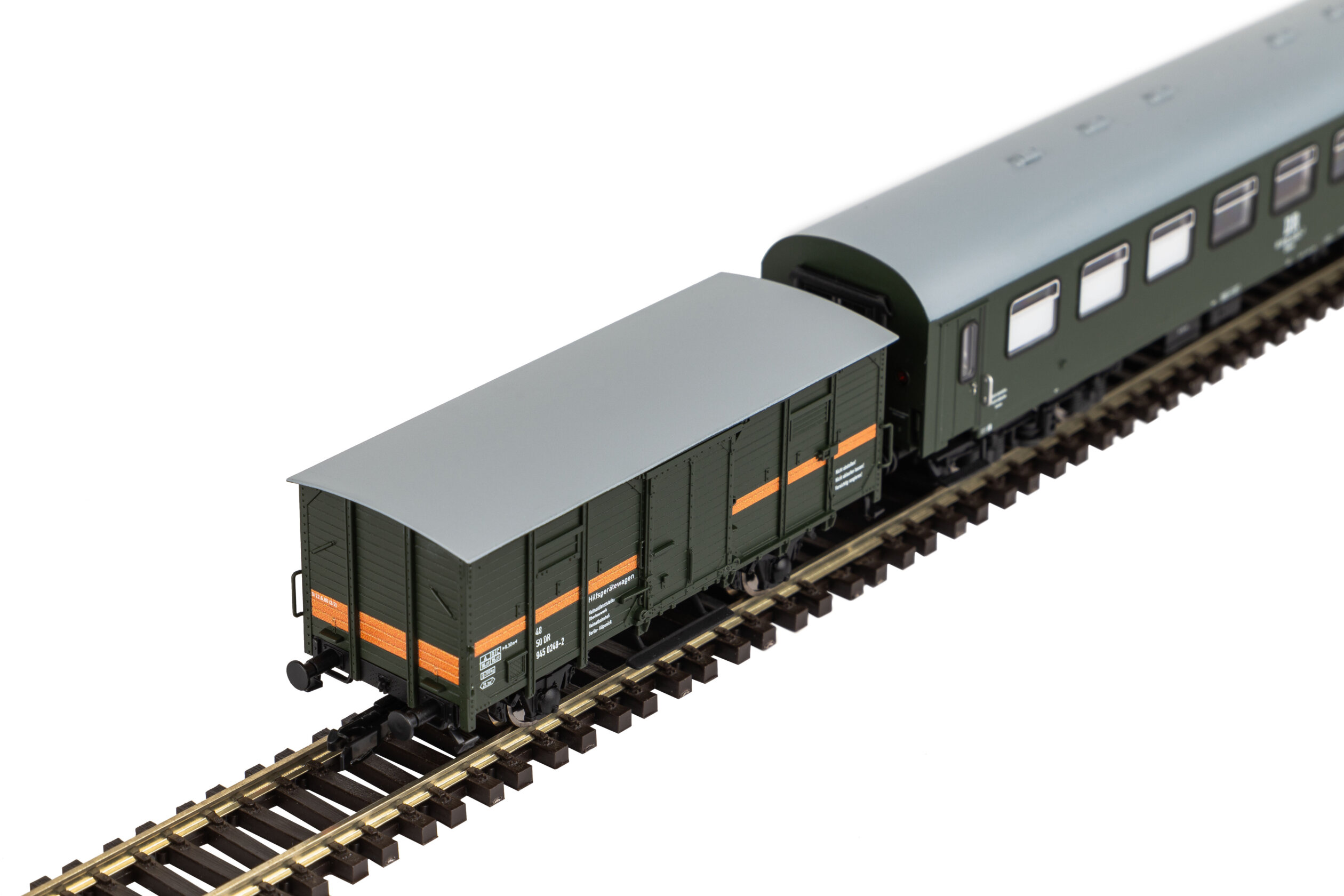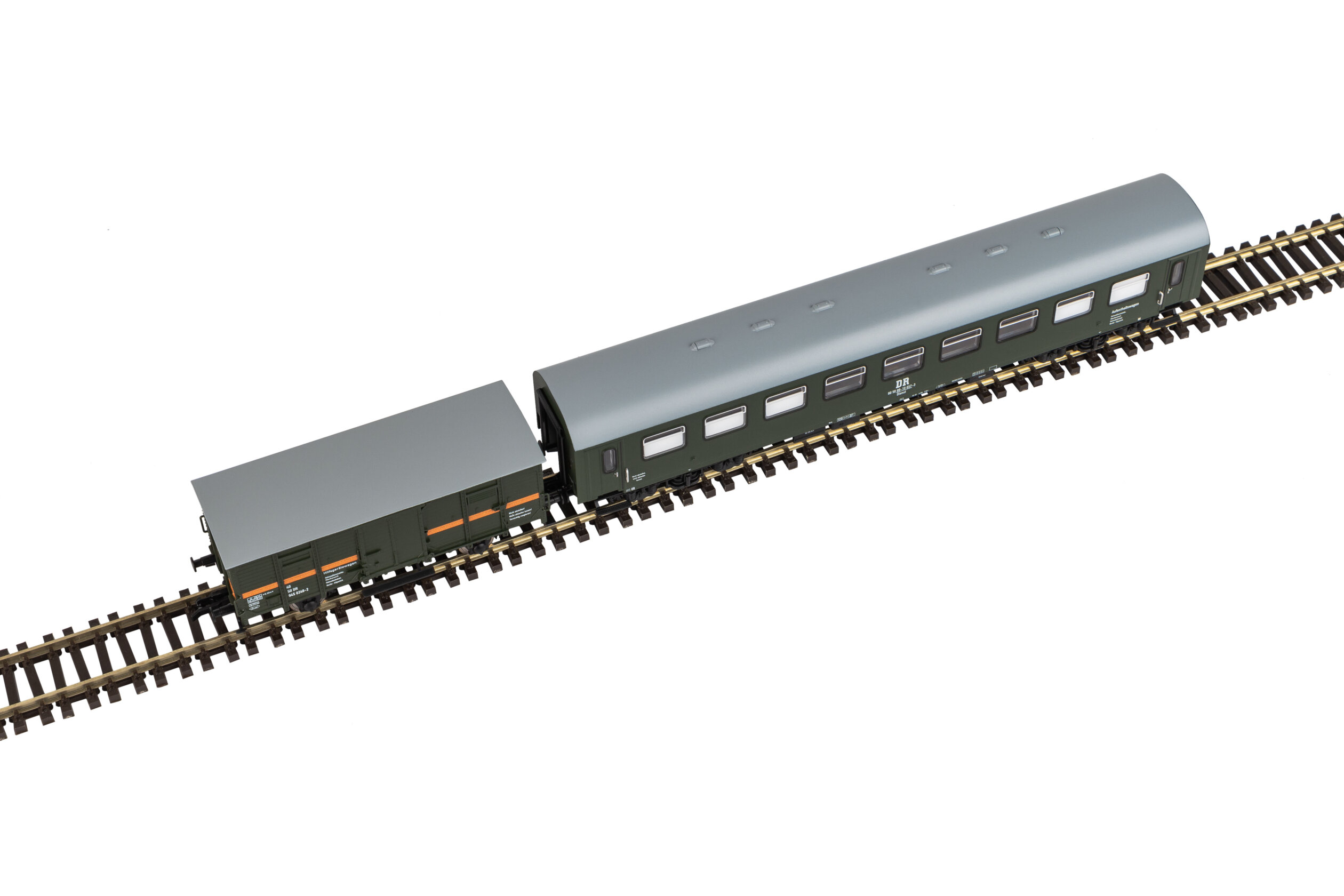 Wagenset bestehend aus einem Rekowagen und einem gedeckten Güterwagen vom Typ G02 in der Lackierung und Bedruckung eines Oberbaumesszuges der DR in Epoche IV. Die Modelle verfügen über TT Kurzkupplungen.