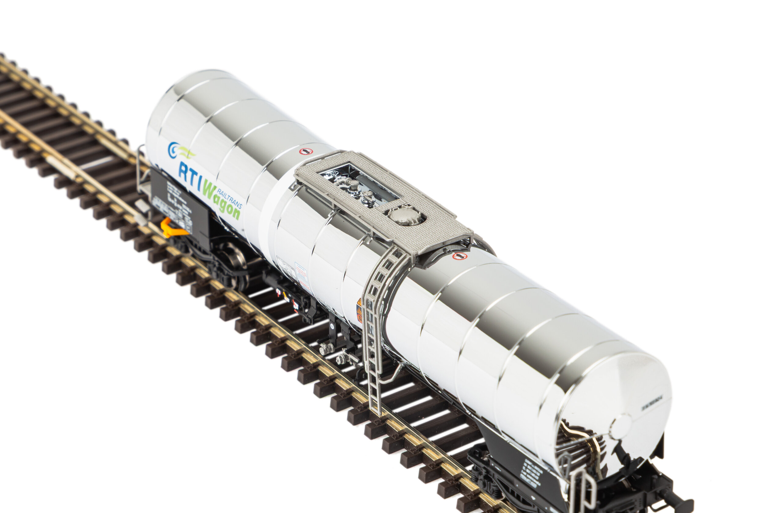 Der vierachsige Chemiekesselwagen im Maßstab 1:120 besticht durch freistehend montierte Leitern, Griffstangen und den verchromten Hochglanzkessel im RTI-Design.