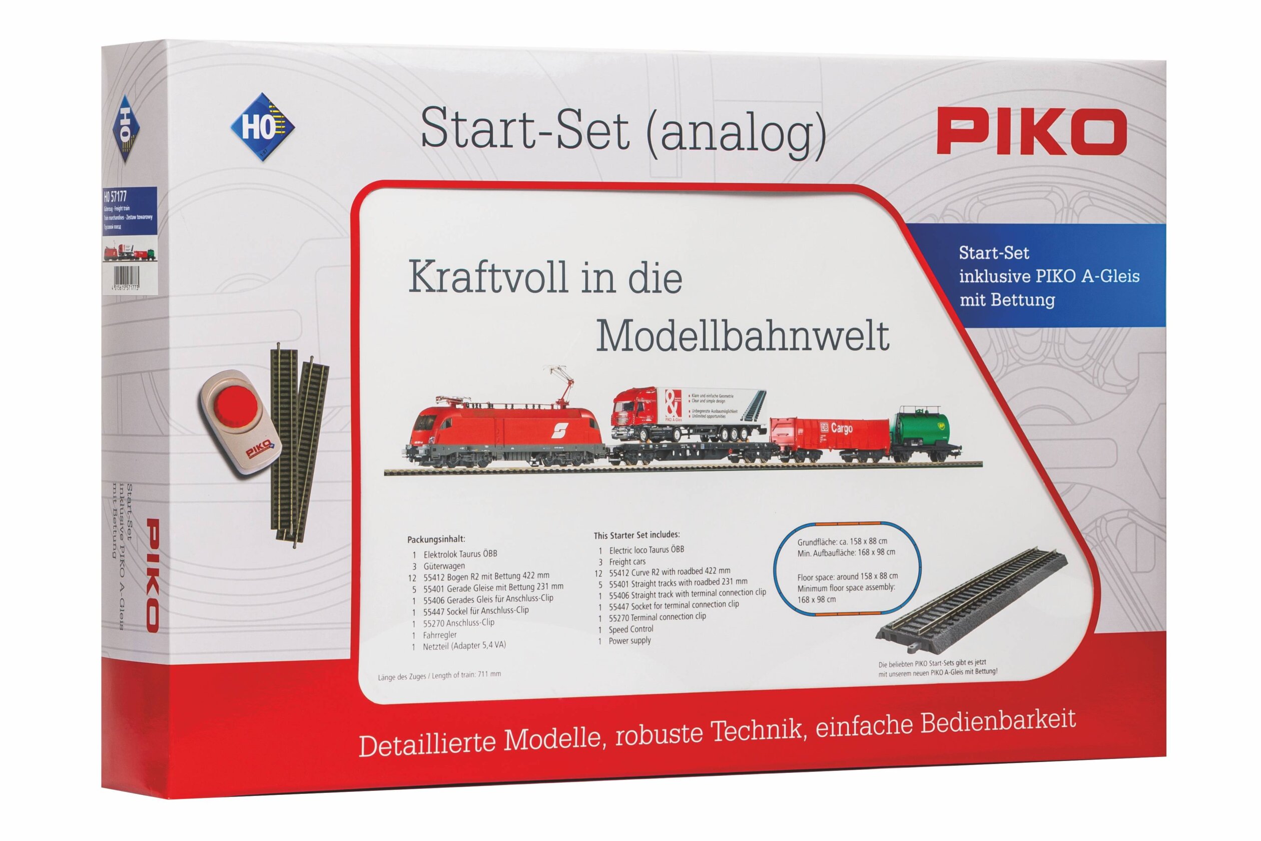 Start-Set A-Gleis mit Bettung bestehend aus einer E-Lok der Taurus-Familie mit drei Güterwagen, davon einer beladen mit einem LKW-Sattelzug.