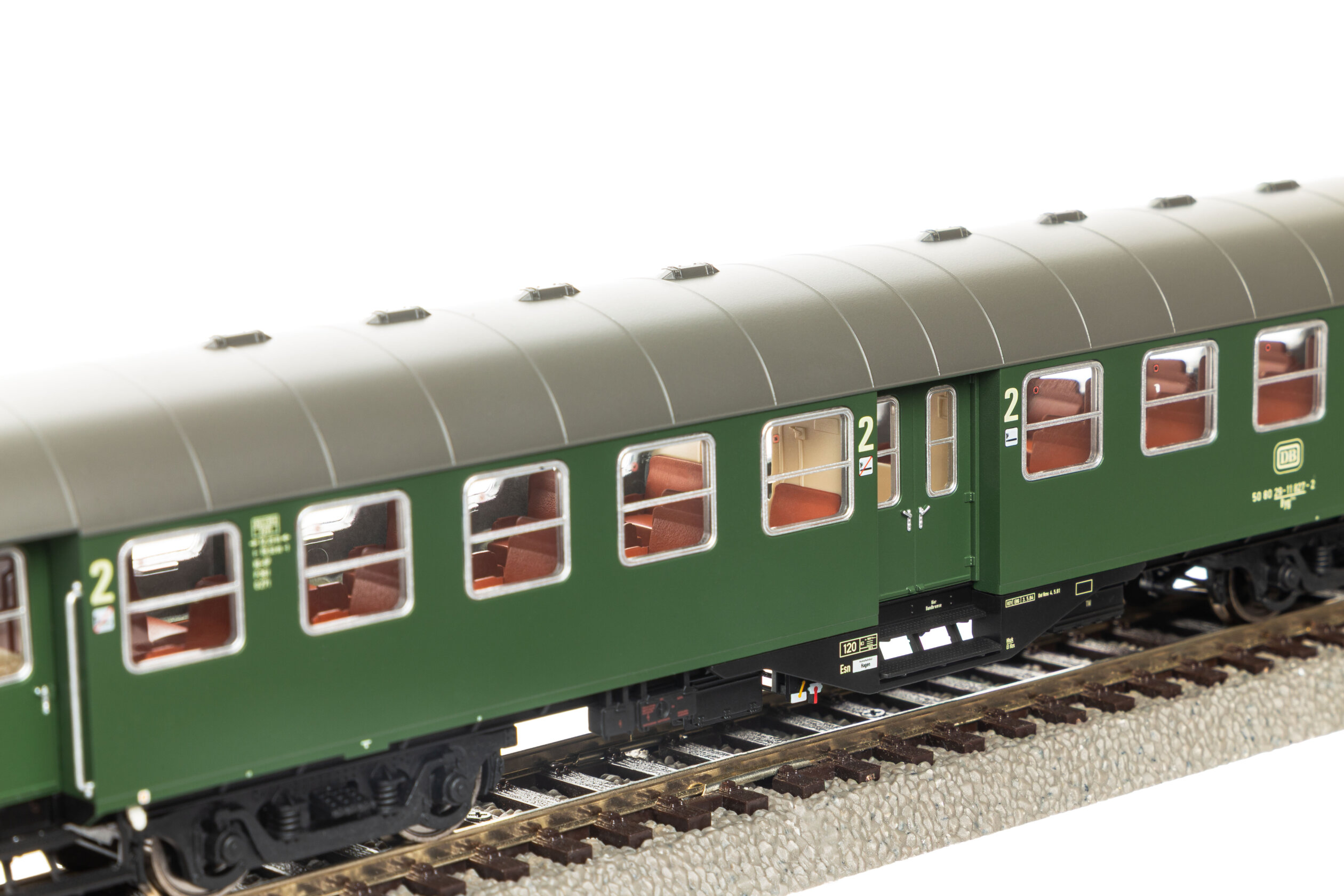 Umbauwagen 2. Klasse B4yg DB Ep. IV, mit Pennsylvania Drehgestellen (Schwanenhals)| Innenbeleuchtung und Schlusslicht nachrüstbar | Kurzkupplungskinematik | Feine Griffe und Trittstufen | Angesetzte Bremszylinder, Batteriekästen und Toilettenrohre | Bremsschläuche und Kuppelhaken beiliegend