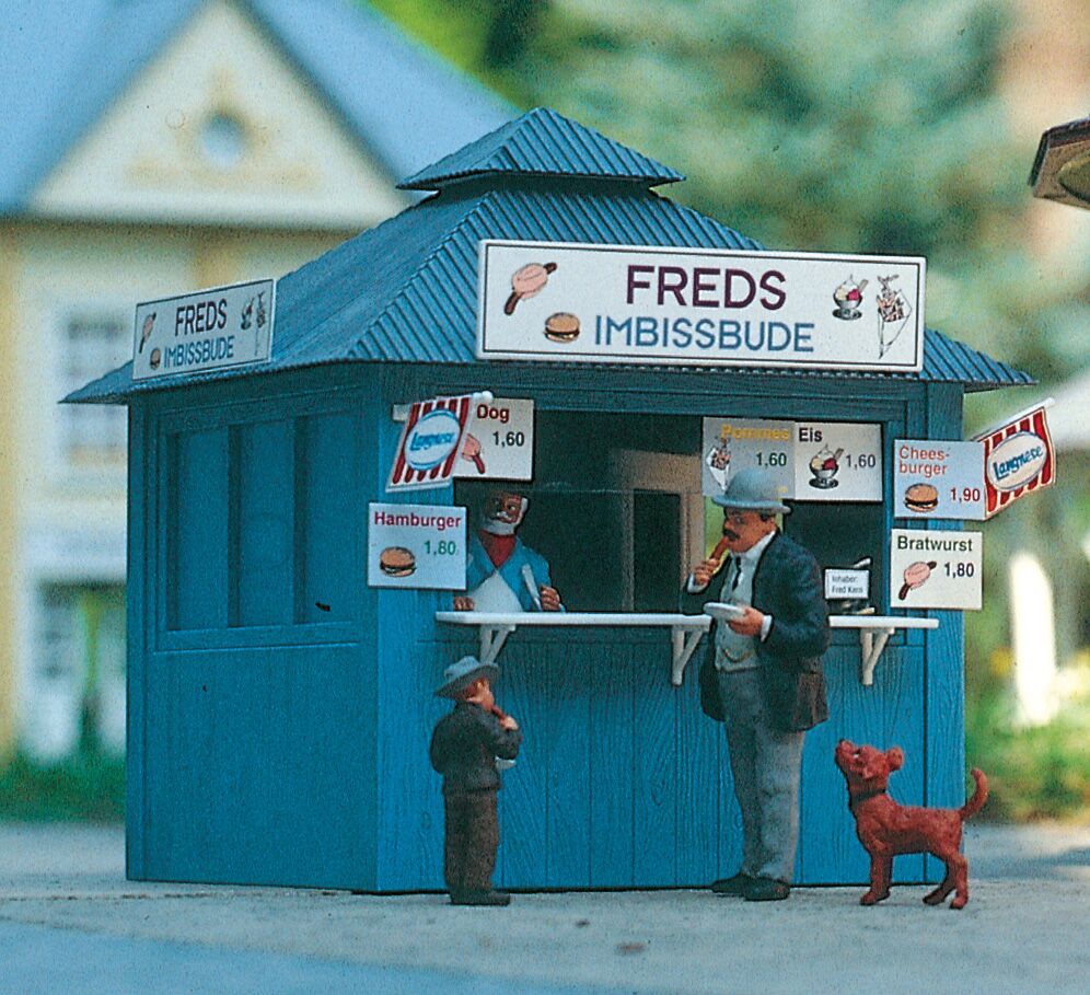 Bei Freds Imbiss ist von Hot Dogs und Hamburgern bis hin zu Eis und Zeitschriften einfach alles zu haben. Die Bude ist wetterfest und realistisch gealtert. Viel Zubehör wie Fahnenstangen, Zeitungsständer usw. vervollständigen diesen Bausatz. Die Tür auf der Rückseite ist beweglich. Als Ergänzung wird die Bodenplatte #62005 (1x) empfohlen.
