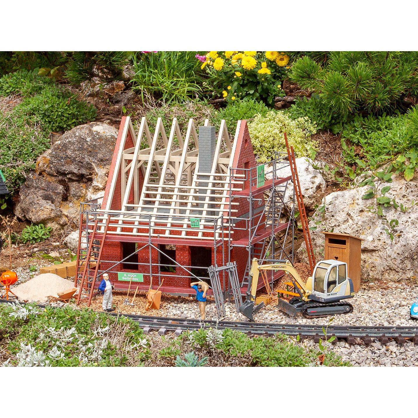 Mehrteiliges Baugerüstsystem, bestehend aus Bordbrettern, Geländern und Aufstiegsleitern für die einzelnen Gerüstetagen. Mit dem Baugerüst lassen sich bis zu zwei Hausseiten einrüsten.