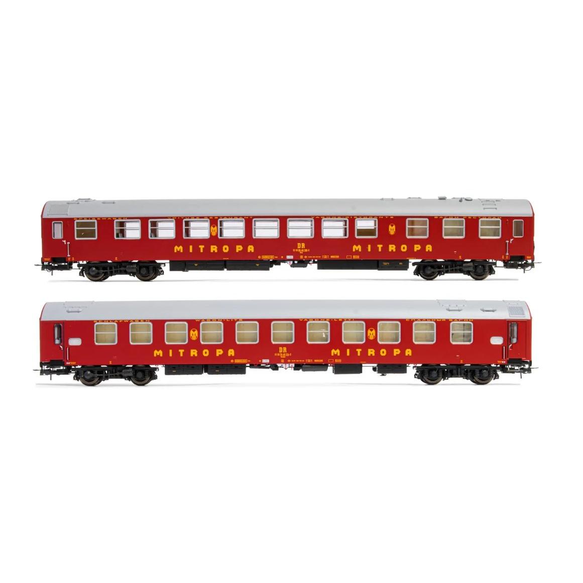 2tlg. Wagenset “Pannonia-Express” der DR, in Epoche IV. Fein detaillierte Ausführung mit exakter vorbildgerechter Bedruckung. Mit Inneneinrichtung. Kupplungsaufnahme nach NEM 362 mit Kurzkupplungs-Kinematik.