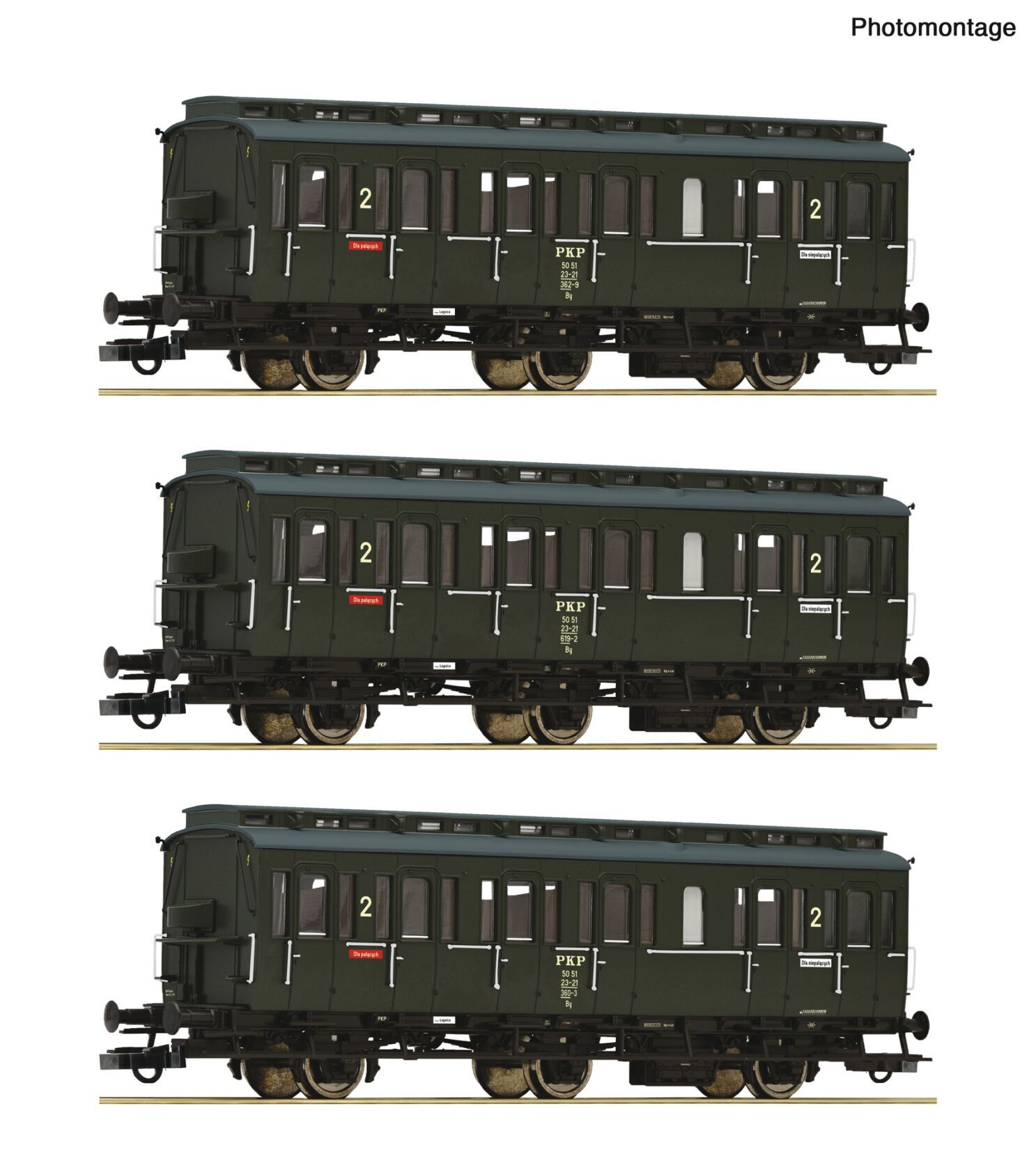 Wagenset mit drei (ex preußischen) Abteilwagen, Gattung By, der Polnischen Staatsbahnen, passend u.a. zur Dampflok Ok1-360 Art.-Nr. 71384.