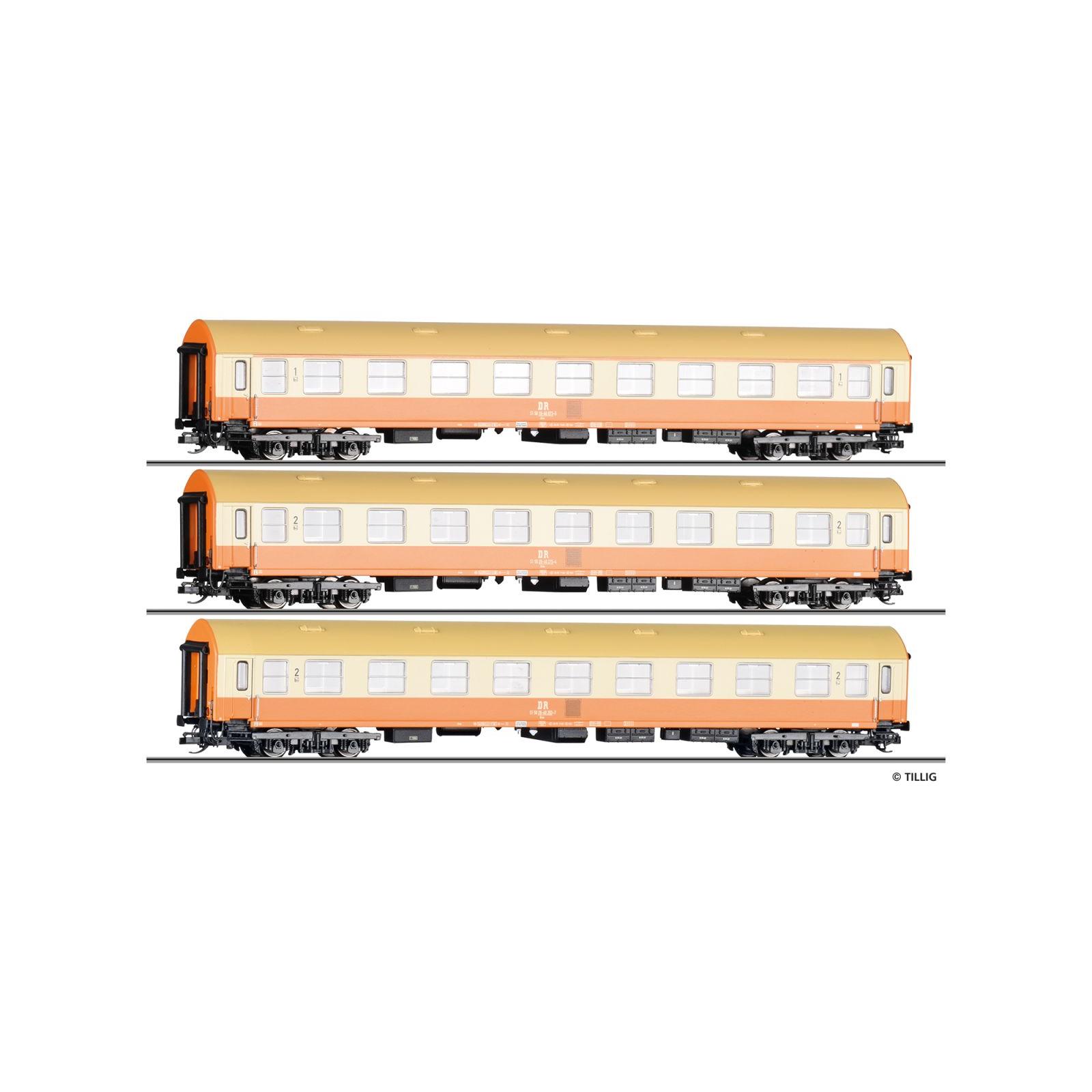 Personenwagenset „Städteexpress“ der DR, bestehend aus drei Reisezugwagen Typ Y/B70 mit hellbraunem Dach