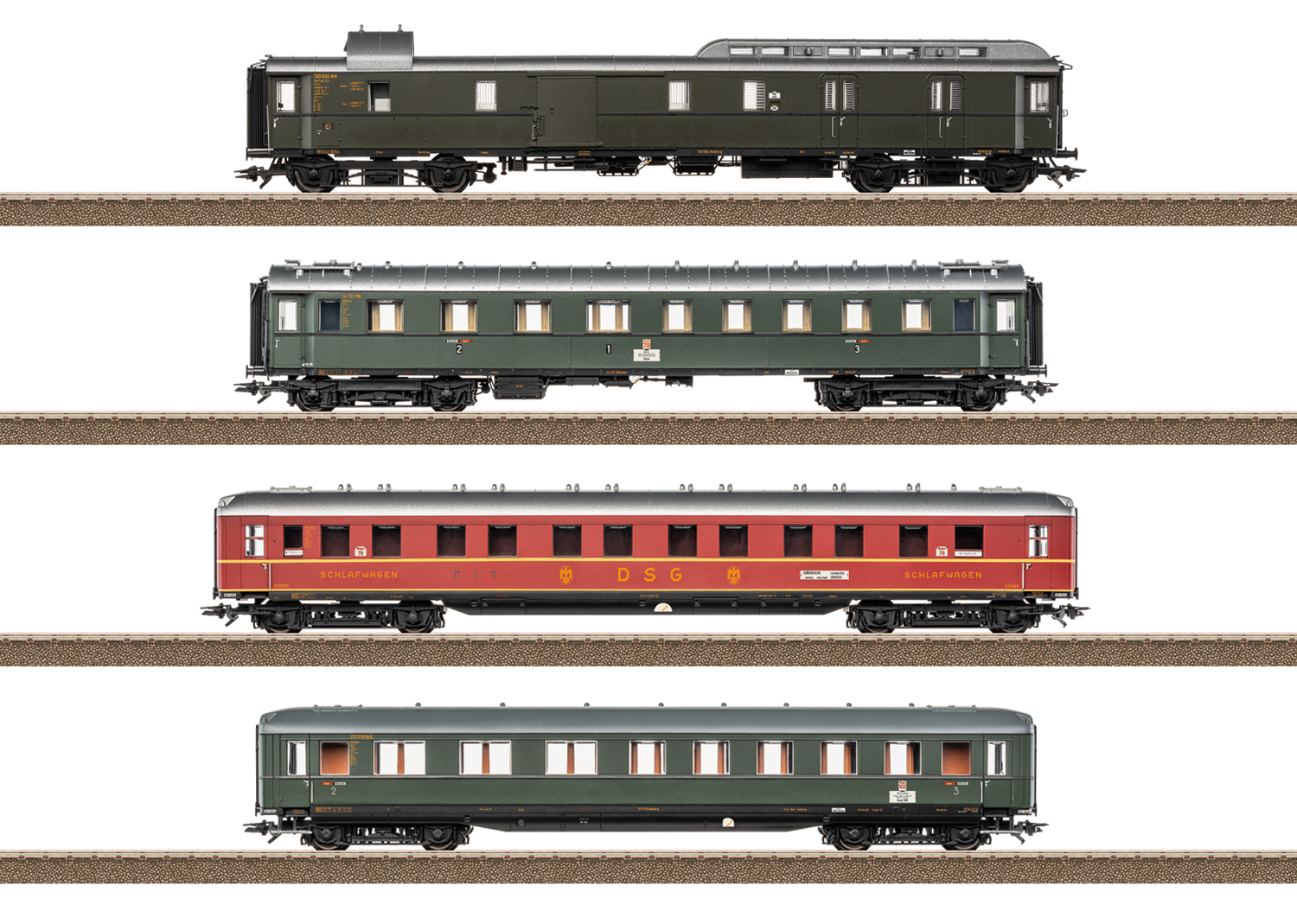 Vorbild: Schnellzugwagen-Set besteht aus den folgenden 4 Wagen unterschiedlicher Bauarten zum Schnellzug D 74. Ein vierachsiger Gepäck- und Postwagen PwPost4ü. Ein vierachsiger Sitzwagen ABC4ü, 1./2./3. Klasse (Einheitsbauart 1928-30). Ein vierachsiger Schürzen-Schlafwagen WLAB4ü(e) der DSG und ein vierachsiger Schürzenwagen BC4üwe, 2./3. Klasse. Zuglauf: D 74 Hamburg Altona – Basel SBB, für den Streckenabschnitt Frankfurt-Basel SBB. Deutsche Bundesbahn (DB) und Deutsche Speisewagen- und Schlafwagen-Gesellschaft (DSG). Betriebszustand um 1955.