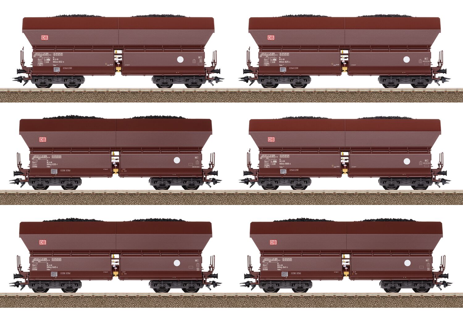 Vorbild: 6 vierachsige, großräumige, offene Selbstentladewagen Bauart Falns 182 der Deutschen Bahn AG (DB AG). Eingesetzt zum Transport von nässeunempfindlichen Schüttgütern. Rotbraune Grundfarbgebung. Alle Wagen mit 2 Übergangsbühnen. 3 Wagen mit Handbremse an einer Übergangsbühne und 3 Wagen ohne Handbremse. Drehgestelle der Bauart 665. Betriebszustand um 2015.