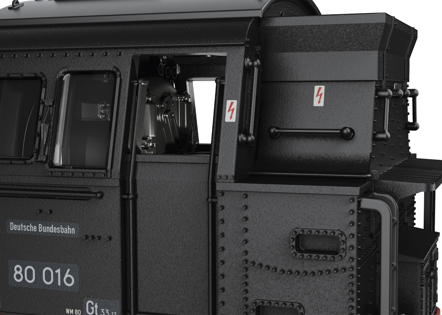 Vorbild: Tenderlokomotive Baureihe 80 der Deutschen Bundesbahn. Ausführung mit drei Kesselaufbauten, Läutewerk und Turbodynamo links, Rauchkammertüre ohne Zentralverschluss mit Nummernschild mittig. Tiefschwarze Grundfarbgebung. Betriebsnummer 80 016. Betriebszustand um 1953.
